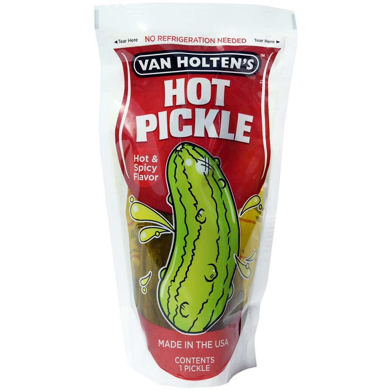 Savourez le cornichon de Van Holten dans une pochette. Le mélange de saveurs chaudes et épicées rend ce cornichon extra chaud et délicieux.